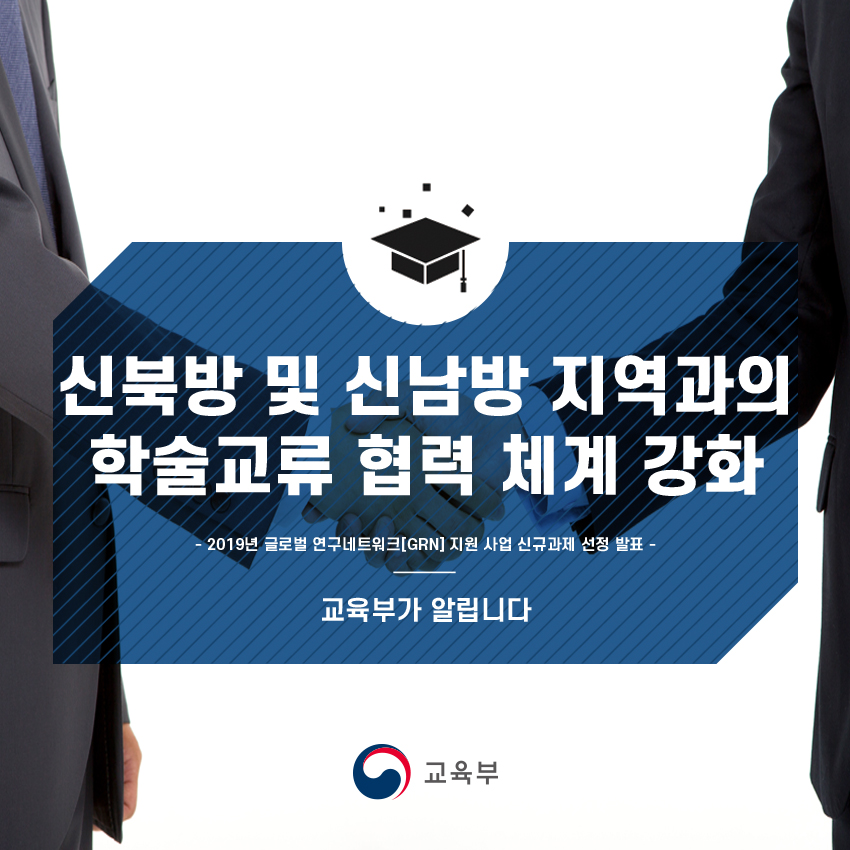 교육부(부총리 겸 교육부장관 유은혜은 「2019년 글로벌 연구네트워크 지원 사업」 신규과제 6개를 선정하여 발표했습니다.
