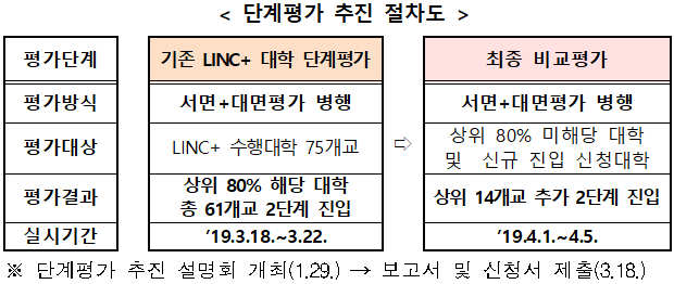 ① LINC+ 사업 단계평가는 1차로 기존 75개 대학을 평가하여, 상위 80%에 해당하는 대학을 향후 3년간(2단계, '19년~'21년) 계속 사업비를 지원하는 대학으로 우선 선정하였고,