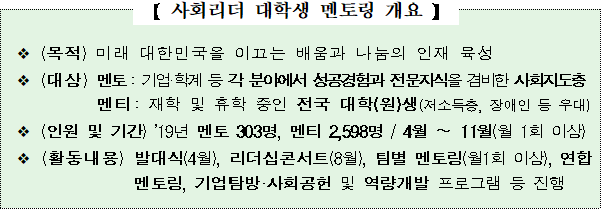 ① 사회리더 대학생 멘토링」은 기업 최고경영자, 석학, 고위공직자 등 사회 각 분야 리더인 ‘멘토’가 대학생 ‘멘티’를 바른 품성과 지도력을 갖춘 미래인재로 이끌어 주는 프로그램입니다.