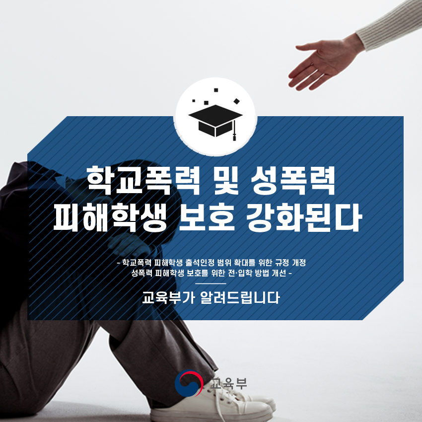 교육부는 앞으로도 학교폭력 및 성폭력 피해학생을 보호하고 어려움을 해결할 수 있도록 힘쓰겠습니다.