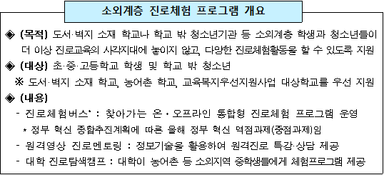 교육부는 소외계층의 진로체험을 지원하기 위해 진로체험버스, 원격영상 진로멘토링, 대학 진로탐색캠프를 제공하고 있습니다. 진로체험버스는 공공기관, 대학, 민간기관들이 참여하여 농어촌 등 소외지역 학교에 무료로 진로체험 프로그램을 제공하는 사업으로 '15년도부터 작년까지 154개 기관에서 5,589개교를 지원했습니다. 원격영상 진로멘토링은 원격영상기술을 활용하여 전문직업인이 농어촌 등 소외지역 소재 학생에게 진로특강, 상담을 제공하는 사업으로 '13년부터 '18년까지 전문직업인 601명이 참여하여 7,093개교를 지원했습니다.