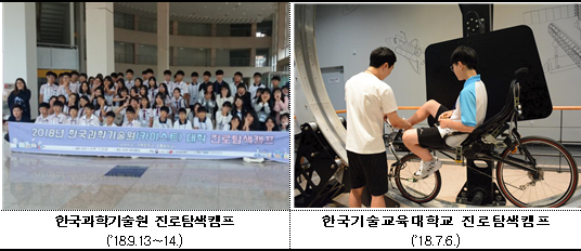 또한, 대학 진로탐색캠프는 국내 유수의 대학이 농어촌 등 소외지역 소재 중학생에게 '16년도부터 '18년까지 24개의 대학이 참여하여 473개교, 10,244명의 중학생의 진로체험을 지원했습니다.