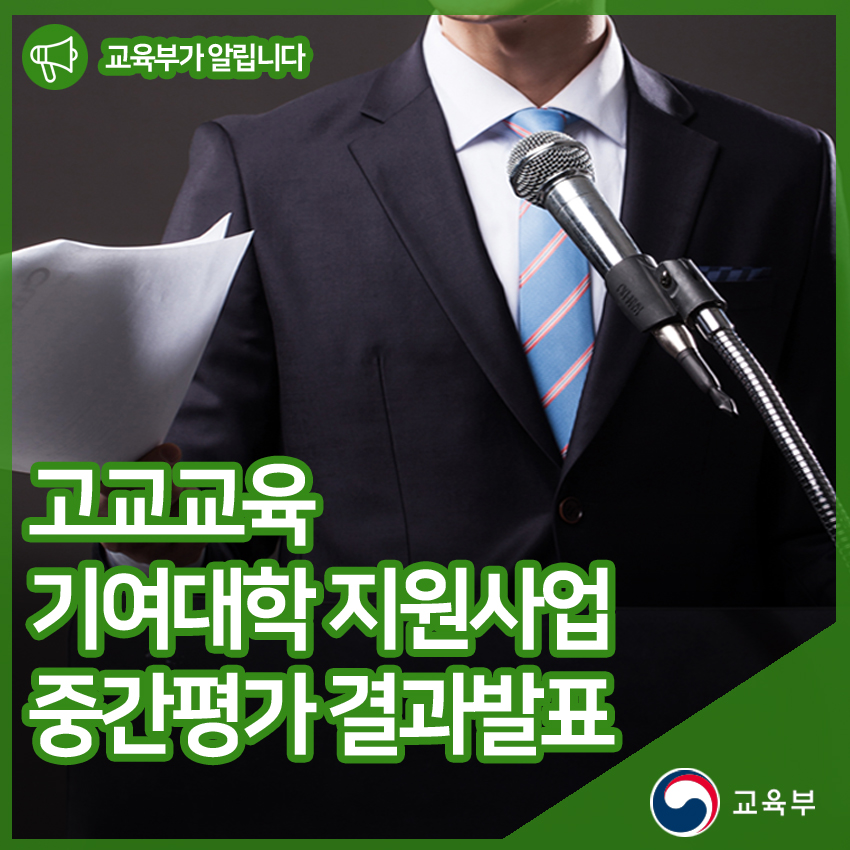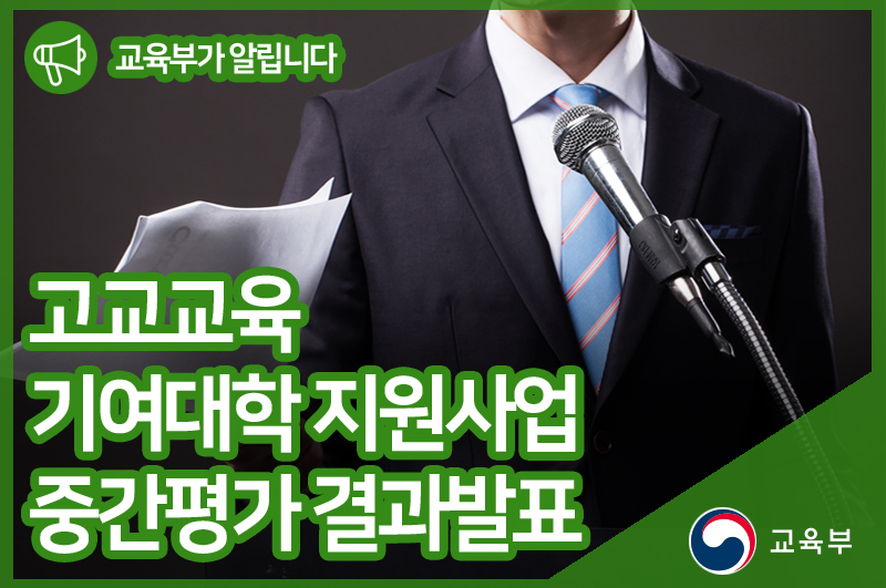 교육부(부총리 겸 교육부장관 유은혜)는 5. 8.(수) 「2019년 고교교육 기여대학 지원사업 중간평가 결과」를 발표했습니다. 이번 중간평가는 대입전형에 대해 이해가 높은 대학 및 고교·교육청 관계자 등으로 구성된 평가위원들이 공정하게 실시하였으며, 사업총괄위원회의 심의를 거쳐 계속지원대학 57교를 선정했습니다.