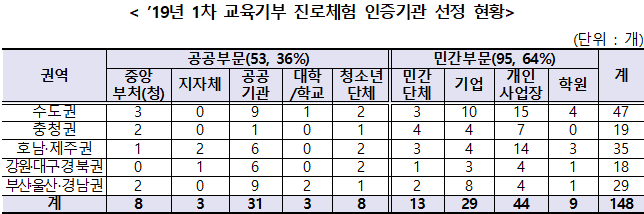 교육부(부총리 겸 교육부장관 유은혜)와 대한상공회의소(회장 박용만)는 2019년 1차 교육기부 진로체험 인증기관 결과를 5월 8일(수)에 발표했습니다. 인증기관은 체험처의 성격, 환경 및 안전성, 프로그램 우수성의 3영역 10개 지표를 바탕으로 엄격한 절차를 거쳐 총 238개 신청기관 중 최종 148개(공공부문 53개, 민간부문 95개) 인증기관이 선정되었습니다.