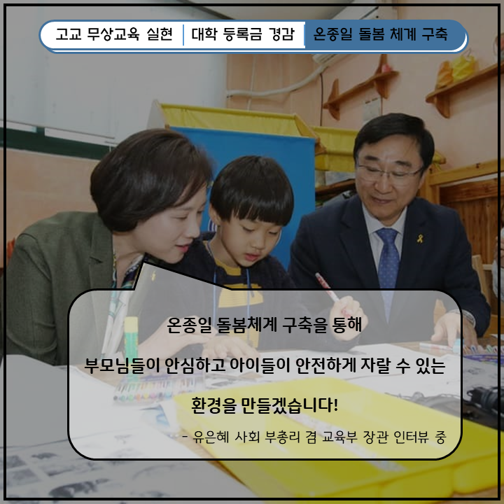 유은혜 부총리 겸 교육부장관은 장관 취임 후 가장 먼저 내세운 정책 또한 '돌봄교실'인데요. 한 언론사와의 인터뷰에서 "온종일 돌봄체계 구축을 통해 부모님들이 안심하고 아이들이 안전하게 자랄 수 있는 환경을 만들겠다"는 이야기를 하기도 했습니다. 그만큼 아이들이 바르게 자랄 수 있도록 하는 교육환경에 신경을 쓰는 정책이라고 생각합니다.