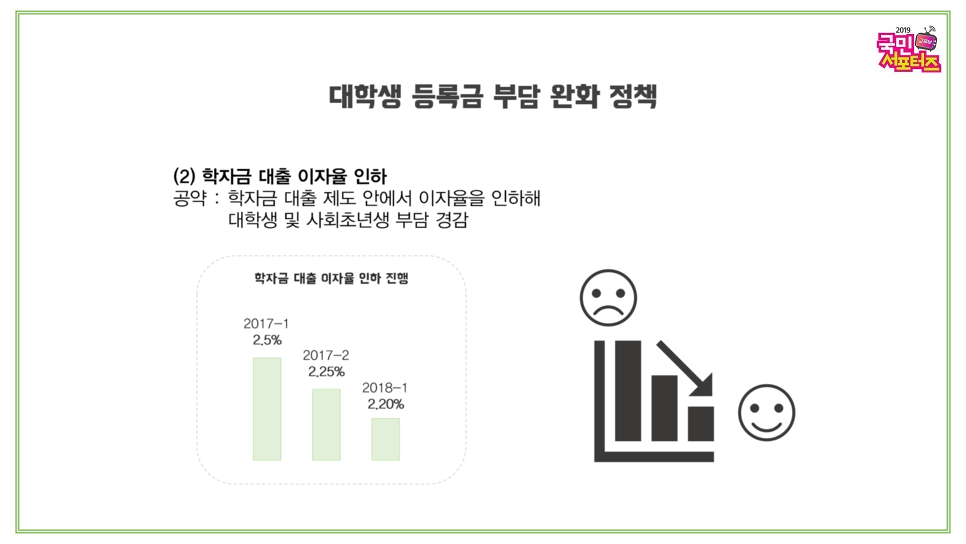 이외에도 추가적인 예산 투입은 2017년 2.5%에서 2018년 2.2%까지 하락한 학자금 대출 이자율 또한 앞으로도 지속적으로 부담이 줄어들 수 있도록 해야 할 것입니다. 앞으로의 적극적인 예산 투입을 통한 등록금 부담 완화정책이 더욱 기대됩니다.