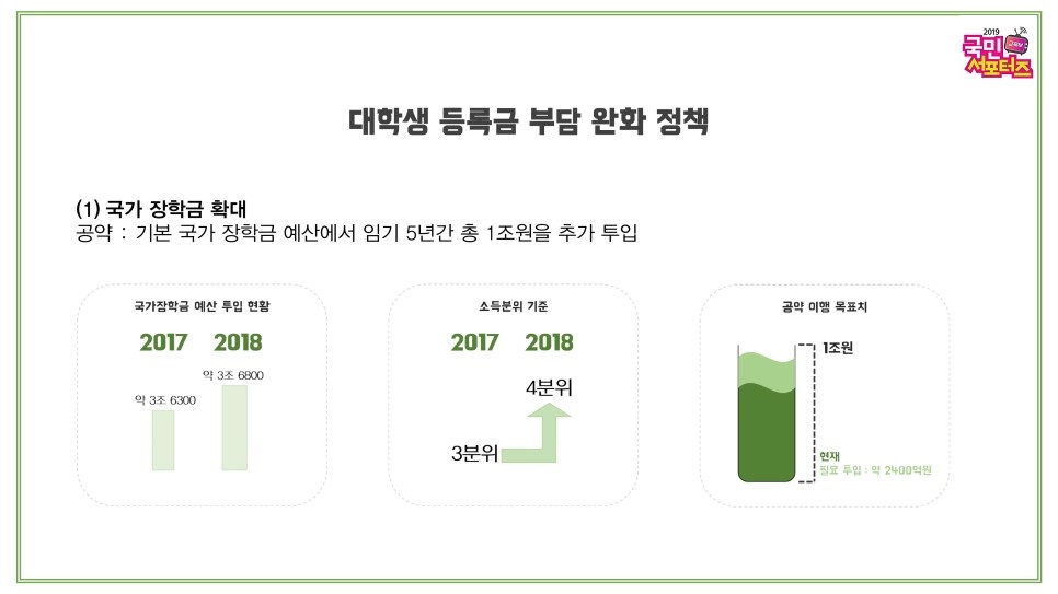 먼저 국가장학금 확대에 대해 소개해 드리겠습니다. 2017년 국가장학금 예산에서 임기 5년 간 총 1조원을 추가 투입하겠다는 공약을 지키기 위해 꾸준히 국가장학금 예산을 늘리고 있습니다. 이에 2018년에는 국가장학금 예산을 3조 6,800억 원으로 편성하여, 2017년 대비 약 500억 원을 추가로 투입하였음을 확인할 수 있었습니다. 또한, 절반 이상 등록금을 지원받는 소득분위 기준도 기존 3분위에서 4분위로 확대 편성하여 수혜대상의 범위를 확대되었습니다. 이러한 지속적인 노력에 이어 임기 기간 내에 1조원을 투입하겠다는 방침을 지키기 위해선 아직 약 2,400억원의 추가 투입이 필요한 상황입니다.