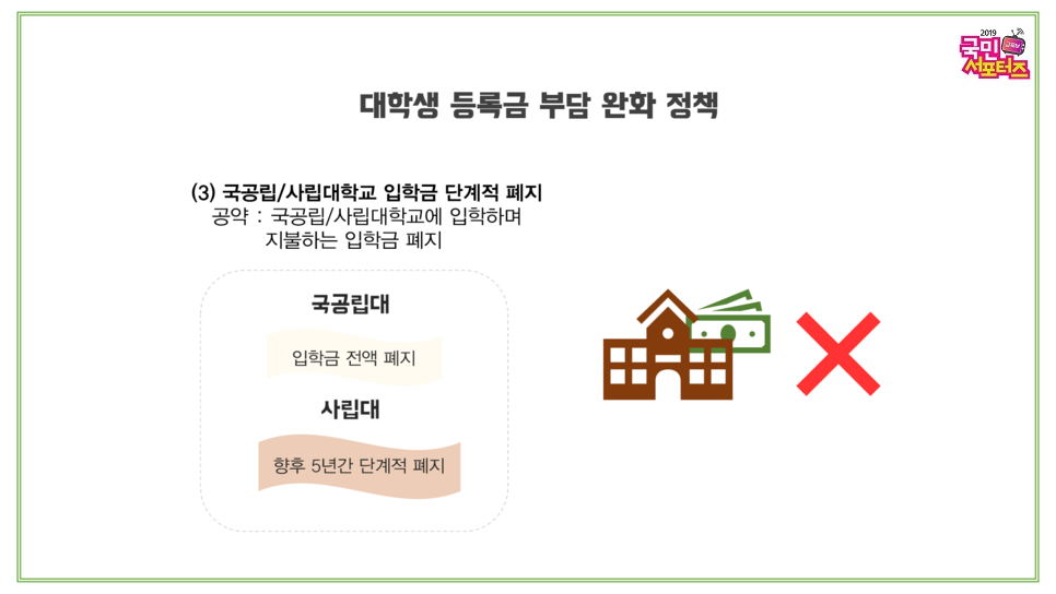 이 정책은 문재인 대통령이 직접 언급하면서 가장 관심이 쏠렸던 정책인데요. 국공립/사립대학교에 입학하며 지불하는 입학금을 단계적으로 폐지하겠다는 내용의 정책입니다. 이에 국공립대는 즉시 2018년부터 전액 입학금을 폐지하는 것으로 확정하였으며, 사립대는 향후 5년간 단계적으로 입학금 폐지 수순을 밟아가겠음을 약속하였습니다. 이 정책을 통해 적게는 10만원 초반, 많게는 90만원대 까지 웃돌았던 입학금에 대한 입학생들의 부담을 덜 수 있게 되었습니다.