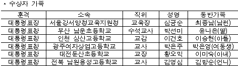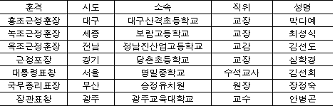 특히, 행복학교를 운영하며 행복나눔콘서트를 통해 소통과 공감이 있는 학교 문화를 조성한 산격초등학교 박다예 교장선생님이 홍조근정훈장을 수여받았으며, 매일 아침마다 교문에서 아이들의 이름을 직접 불러주며 등교맞이를 함으로써 학생들과 소통과 공감을 몸소 실천한 천안백석중학교 채정숙 교장선생님이 대통령 표창을 수여받았습니다.