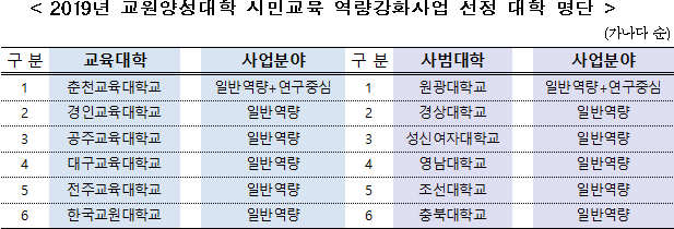 교육부(부총리 겸 교육부장관 유은혜)와 한국연구재단(이사장 노정혜)은 「2019년 교원양성대학 시민교육 역량강화사업」의 재정 지원 대학 12개교를 선정했습니다.