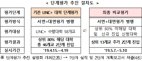 LINC+ 사업 단계평가는 1차로 기존 58개 대학을 평가하여, 상위 80%에 해당하는 대학을 향후 3년간(2단계, '19년~'21년) 계속 사업비를 지원하는 대학으로 우선 선정하였고, 2차로 상위 80%에 해당하지 않는 대학과 새롭게 사업 수행을 희망하는 대학간 비교평가를 거쳐, 향후 3년간(2단계, '19년~'21년) 사업비 지원 대상 대학을 추가 선정했습니다. 이에 따라, 기존 LINC+ 사업 수행대학 대상 단계평가 결과 1차로 46개 대학을 선정하고, 최종 비교평가를 통해 13개 대학을 추가로 선정하여, 총 59개 대학을 향후 3년간 계속 지원할 예정입니다.