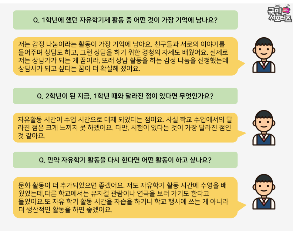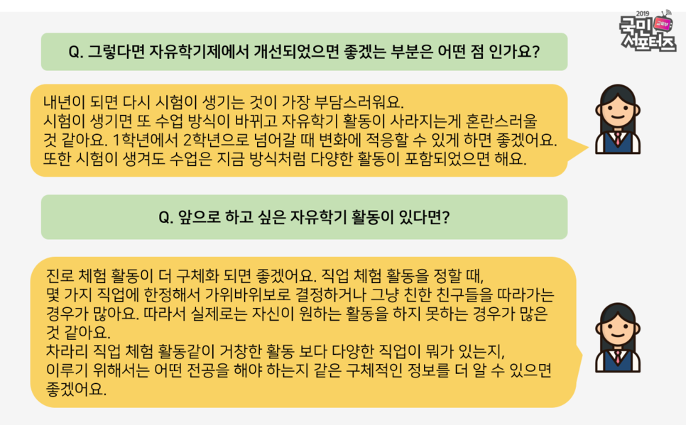 인터뷰에서 학생들은 시험과 더불어 학습 부담이 많이 사라졌고, 창의적인 시간을 보낼 수 있다는 점에서 만족한다고 이야기했습니다. 다만, 학생들이 1학년이 끝나고, 2학년에 되며 다시 느끼는 학습 부담감에 대해서는 개선이 필요할 것으로 보입니다. 또한 진로 활동에서는 막연히 진로 체험 활동을 하기 보다도 다양한 직업에 대한 정보를 제공받고, 내가 원하는 진로를 이루기 위한 구체적인 로드맵을 알고 싶다는 의견도 있었는데요. 이러한 점에서는 개선이 필요하다고 생각합니다.