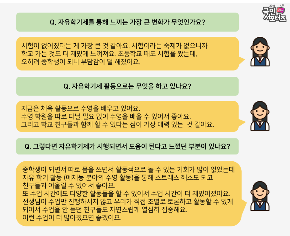 실제로 이 자유학기제를 경험하고 있는 학생들은 자유학기제에 대해 어떻게 생각하고 있을지, 실제 자유학기제를 체험한 중학교 1, 2 학년 학생들을 인터뷰해 보았습니다.