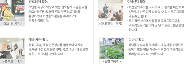 자유학기제는 크게 교과수업 및 자유학기 활동으로 이루어집니다. 교과 수업 내에서는 토론, 실험 및 실습, 프로젝트 학습 등 전 과정에 학생이 주도적으로 참여하는 방식으로 진행됩니다. 학생들은 실생활과 밀접한 형태의 학습을 할 수 있고, 경험을 통한 학습으로 수업에 더 집중할 수 있게 되었습니다. 수업의 형태만 변화하는 것이 아닙니다.