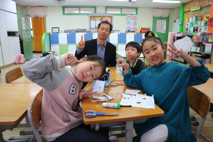여기는 제가 근무하는 경기도 소안초등학교 돌봄교실입니다. 정규 수업이 끝난 후 1, 2학년 아이들이 1층 돌봄교실에 모여앉아 종이접기, 미술, 동화 구연, 블록 쌓기, 보드게임 같은 수업에 참여합니다. 초등돌봄교실에서 많이 하는 프로그램이 독서와 종이접기입니다. 특히 종이접기는 집중력을 높일 수 있어 일본에서도 많이 실시하는 프로그램으로 두뇌 발달에도 좋고 구체적 조작기에 진입한 아이들에게 유익합니다.