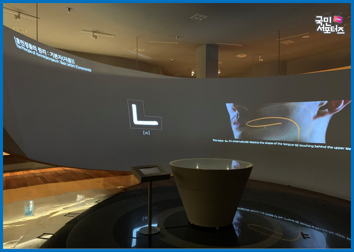 1부에서는 한글이 없던 시대에 차차 표기로 문자를 대체했던 과거를 시작으로, 한글이 만들어지고 사용되어 왔던 역사를 표로 정리해서 알려주고 있습니다. 위의 사진처럼 한글 제작원리를 영상으로 확인하실 수 있으며, 훈민정음해례본 역시 직접 보실 수 있습니다.