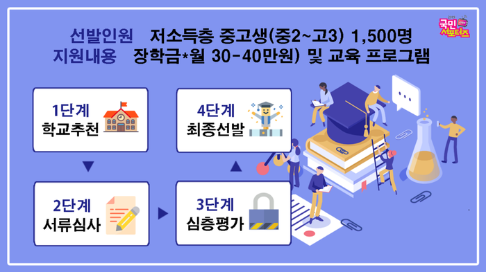 이번 사업에서 작년에는 300명이었던 지원 대상자가 이번에는 1,500명으로 늘어났다는 점에서 큰 의미가 있습니다. 선발 절차는 학교 추천( 1단계) → 서류심사 및 심층평가(2· 3단계) → 최종 선발( 4단계)로 이루어지고 지원 내용 또한 다양합니다. 선발된 장학생은 경제적 지원 뿐만이 아닌 학업에 열중하고 성장할 수 있는 다양한 활동들을 경험해볼 수 있습니다. 원래 4월 26일까지었던 지원 마감일이 5월 10일로 연장되어 소식을 늦게 접해 아쉬웠던 학생들에게도 다시 한 번 기회가 주어지기도 했는데요.