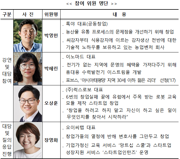 ⑦ 먼저 학창시절의 고민과 창업가로 도전하기까지의 성공과 실패 경험들, 경험에서 배운 점 등을 강연하고,