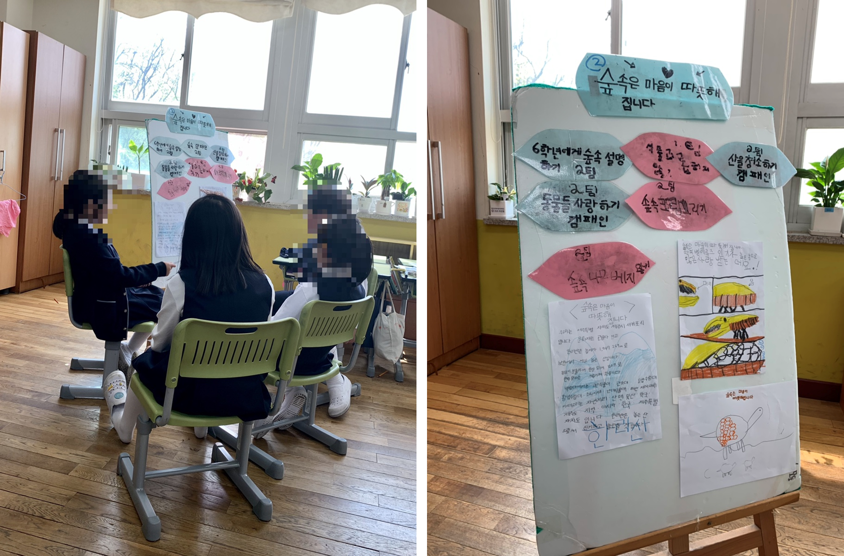 1학년 통합 주제, '봄'에서 봄 동산을 돌아보며 배경지식을 활성화한 후, 아이들이 봄에 대해 질문을 유도했습니다. 질문을 통해 프로젝트를 기획하고, 1차 질문에 대한 기초지식을 함께 형성해 나갔어요. 그 후 2차 질문을 통해 전문가 집단을 모집했고, 분야의 전문가들이 2차 조사를 통해 결과물을 제작하고, 이를 학급 친구들과 공유하는 과정을 거칩니다. 이로써 자신을 성찰하고 서로 피드백과 질문을 나눌 수 있게 되는 것입니다.