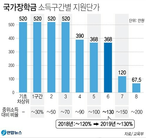 지난 2월 교육부에서는 ‘2019년 국가장학금 운영 기본계획’을 발표하였습니다. 국가장학금은 일정한 성적기준을 충족하는 대학생들에게 가정의 경제적인 부분을 고려하여 지원하게 되는 장학금입니다. 정부는 기초생활수급자, 차상위계층 구간부터 10구간까지 총 11개 구간으로 나뉘는데 여기서 8구간까지를 국가장학금 대상자로 설정하고 있습니다.