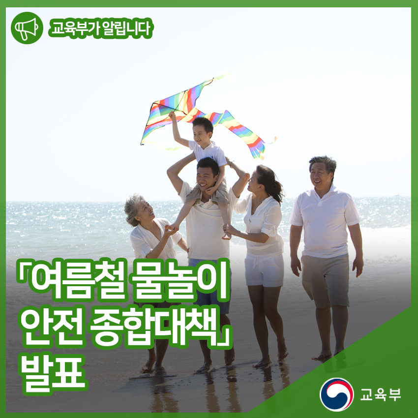 정부는 본격적인 여름철 물놀이 시기를 맞아 물놀이 사고 및 인명피해 최소화를 위한 ‘여름철 물놀이 안전 종합대책’을 발표했습니다. 이번 종합대책은 그 간 강, 계곡, 해수욕장 등 물놀이 안전관리가 소관 부처별로 추진되었던 것을 관계 부처가 합동으로 추진함으로써 대국민 홍보 및 교육, 안전점검 등의 물놀이 안전대책을 효율적으로 추진하기 위하여 마련되었습니다.