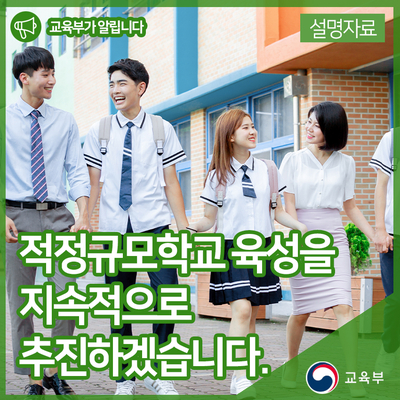 교육부에서는 한 아이도 놓치지 않는 교육을 위하여 ‘작지만 강한 학교’의 원활한 운영을 포함한 적정규모학교 육성을 지속적으로 추진할 예정이며, 맞춤형 교육과정 운영, 행정 지원, 행․재정 지원 시스템 구축 등 지원 방안을 모색하도록 하겠습니다.