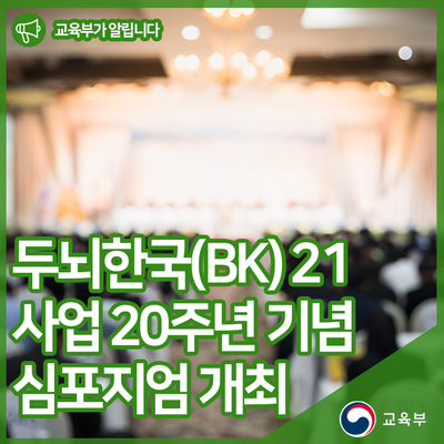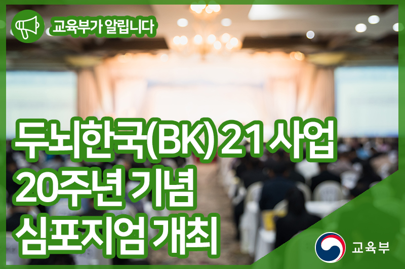 교육부(부총리 겸 교육부장관 유은혜)와 한국연구재단(이사장 노정혜)은 두뇌한국 21(BrainKorea21, 이하 BK21)사업 출범 20주년을 맞아 6월 28일(금) 서울 코엑스(COEX)에서「BK21 사업 20주년 기념 심포지엄」을 개최한다.
