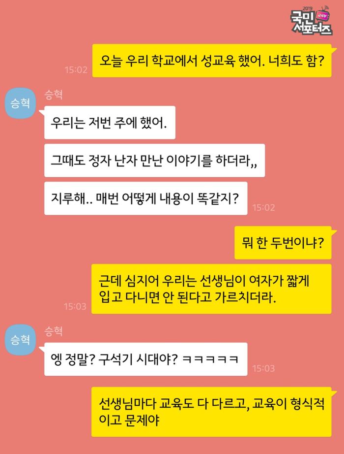 위의 사진은 현재 성교육에 대한 문제점을 학생들이 카카오톡을 하는 상황처럼 만들어서 성교육의 문제점을 잘 인식할 수 있도록 만든 상황입니다. 메신저 내용에서 드러나는 성교육의 문제점은 두 가지입니다. 첫 번째로는 형식적인 교육에 대한 비판이고 두 번째로는 교육의 질이 학교마다 다르다는 것입니다. 우리 사회는 미투 운동으로 성 인식을 키워갔지만 우리 교육은 여전히 정자 난자가 만나는 이야기에 머물러있습니다.