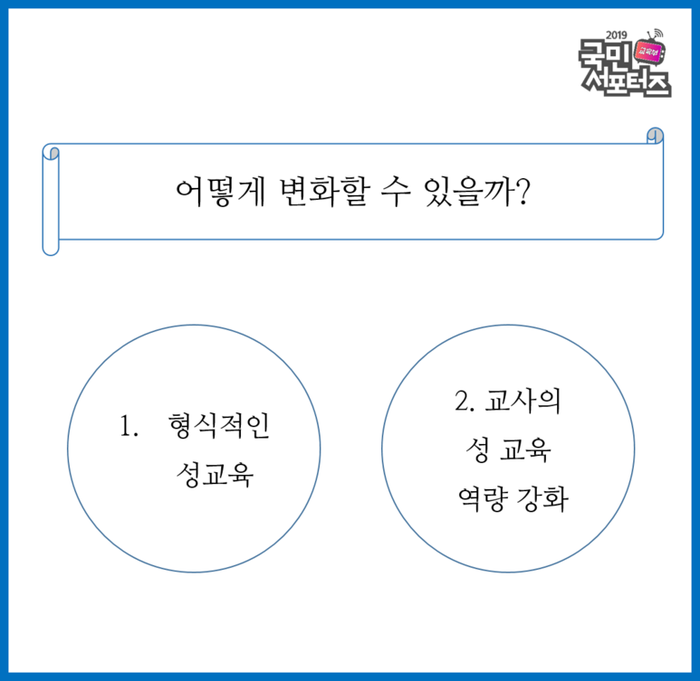 먼저 형식적인 성교육에 변화를 주어야 합니다. 학생들이 바른 성에 대한 인식을 가질 수 있게 교육을 짜야 하며, 학생들이 실질적으로 필요한 지식을 주어야 합니다. 그러기 위해서는 학생들의 이야기를 먼저 들어야 합니다. 성교육에서 어떤 부분을 알려줬으면 좋겠는지, 어떤 부분에서 교육이 지겨운 것인지 듣고 변화를 야기해야 합니다.