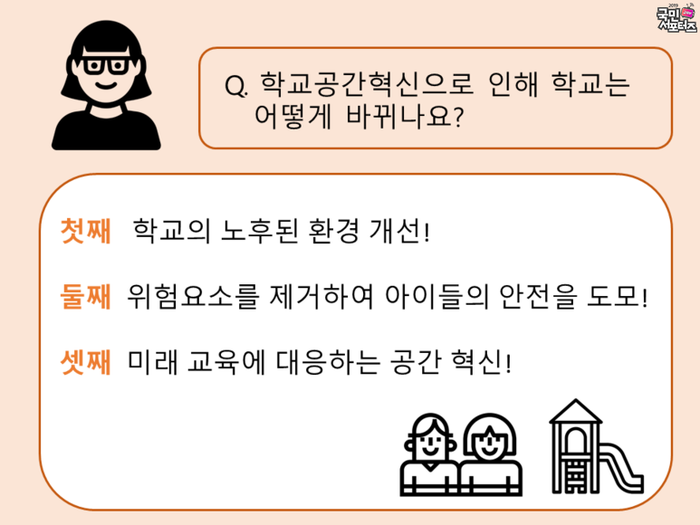 딱딱하고 네모난 모양에 모든 반이 똑같이 생긴 교실. 거기다 일자형 복도와 함께 획일적인 교실풍경은 과거 흔히 볼 수 있는 전형적인 학교의 모습이었습니다. 그러나 이제는 이러한 교실들이 아이들이 놀고 공부하고 마음껏 쉴 수 있는 따뜻한 공간으로 탈바꿈하고 있습니다. 더 이상 교실은 교사들이 학생들에게 지식만을 주입시켜주는 공간이 아니게 되었습니다. 학생들은 자발적으로 학습하고, 여러 친구들과 함께 놀면서 자율성과 더불어 창의성까지 발휘할 수 있는 ‘공간’을 필요로 합니다. 그리하여 교육부는 미래 교육 변화에 부응하는 쾌적하고 안전한 학교 공간 조성을 위해 ‘학교시설 환경개선 5개년 계획’을 발표하게 되었습니다.