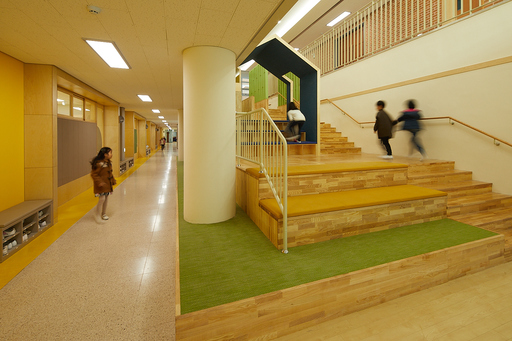 하늘숲초등학교는 유휴시설을 쉼, 놀이 공간으로 적극 활용했습니다. 계단 하부와 넓은 계단을 이용해 ‘북하우스’, ‘플레이하우스’ 등을 만들었습니다. 학교 전체적으로는 학생 성장단계에 따라 3가지 유형으로 나눠 교실별로 특색을 부여했습니다.