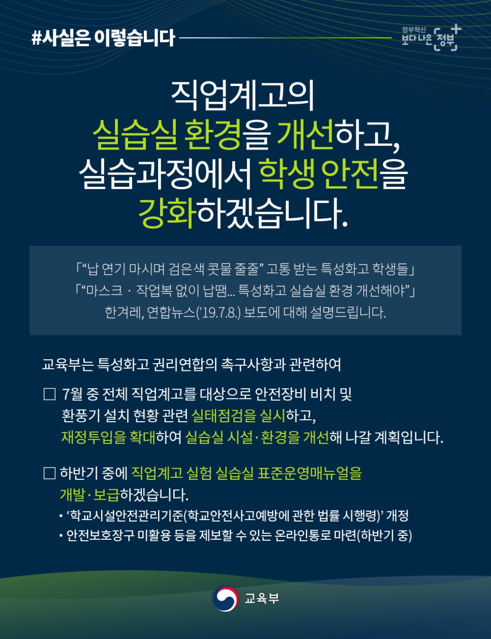 교육부는 7월중 전체 직업계고에 대한 안전 실태조사를 실시하고, 실습실을 개선해 나갈 계획입니다.