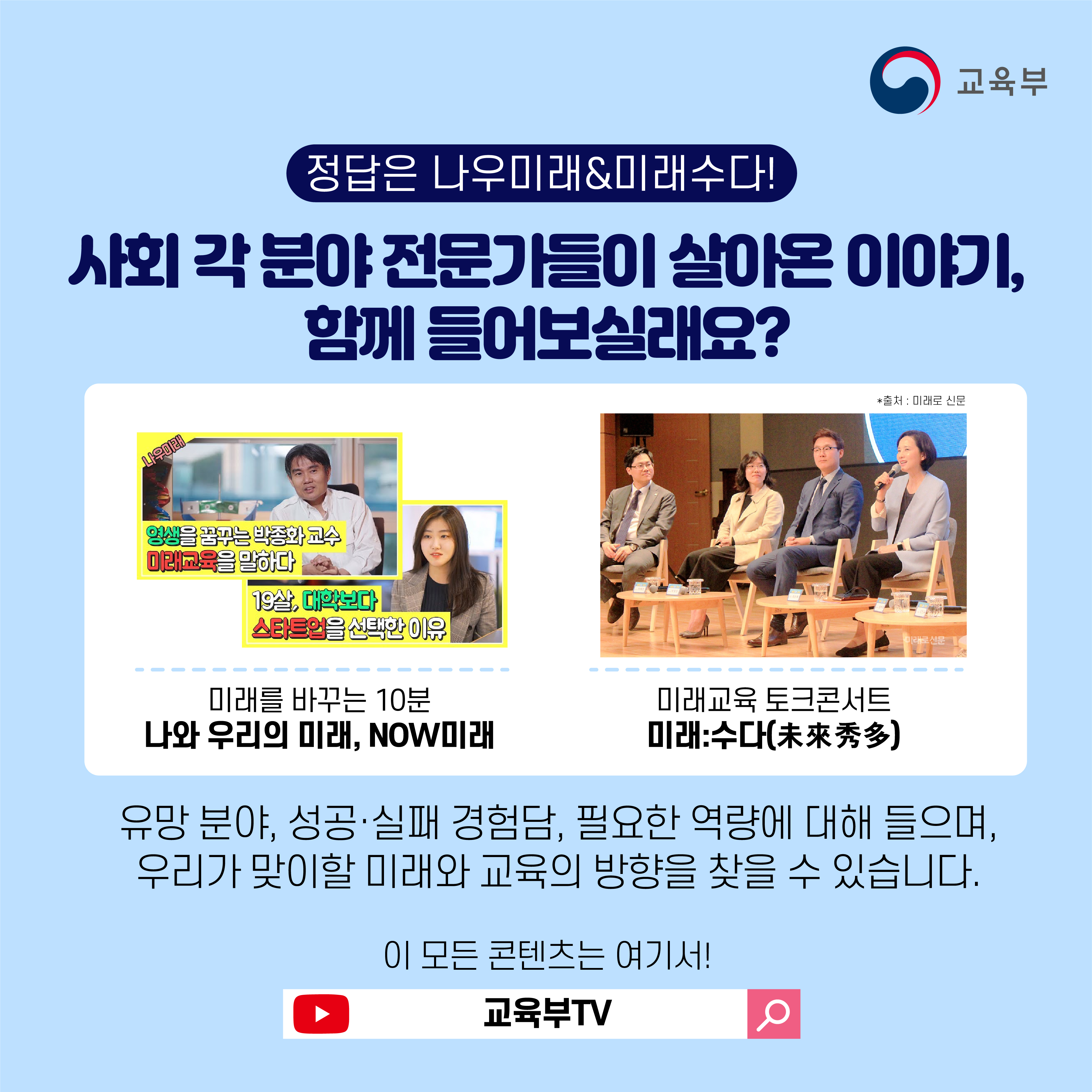 교육부 미디어 채널입니다. 다양한 교육이야기와 진로, 교육비, 대입 등 꼭 필요한 교육정보가 있는 교육부 채널! 구독 및 좋아요를 꼭꼭 눌러주세요~ - 교육부 홈페이지: https://www.moe.go.kr - 교육부 블로그: https://blog.naver.com/moeblo...