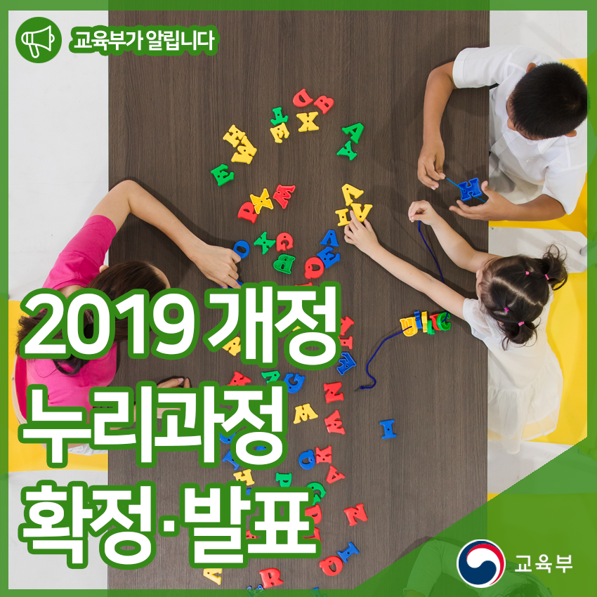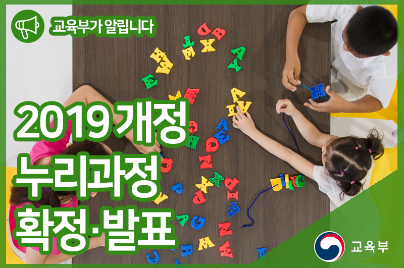 유은혜 부총리 겸 교육부 장관과 박능후 보건복지부 장관은 7월 19일(금), 유아·놀이중심의 「2019 개정 누리과정」을 확정·발표하였다. 개정 누리과정은 국정과제 ‘학생중심의 교육과정 개편’ 정부혁신의 일환으로 ‘유아교육 혁신방안(’17.12.)’에서 제시한 ‘유아‧놀이중심 교육과정 개편’이며 미래 핵심 역량을 반영한 교육과정으로의 전환이다.