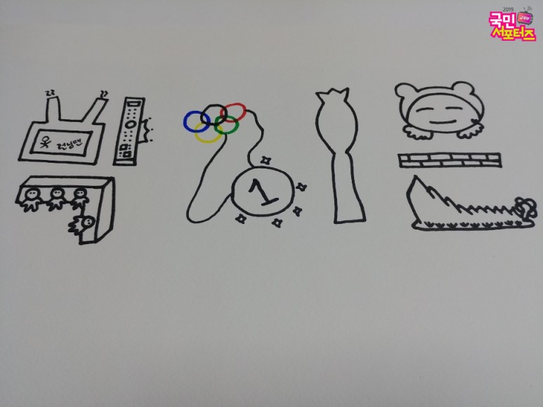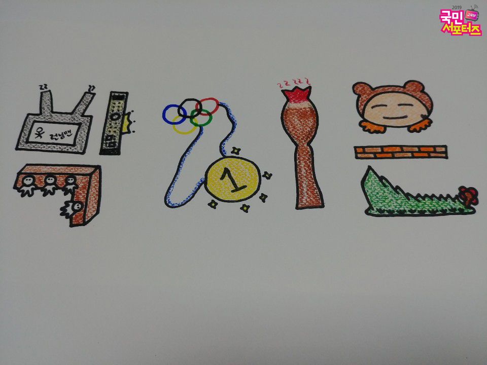 "지"는 올림픽을 떠올리면서 오륜기와 금메달, 그리고 성화를 함께 표현해보았어요.