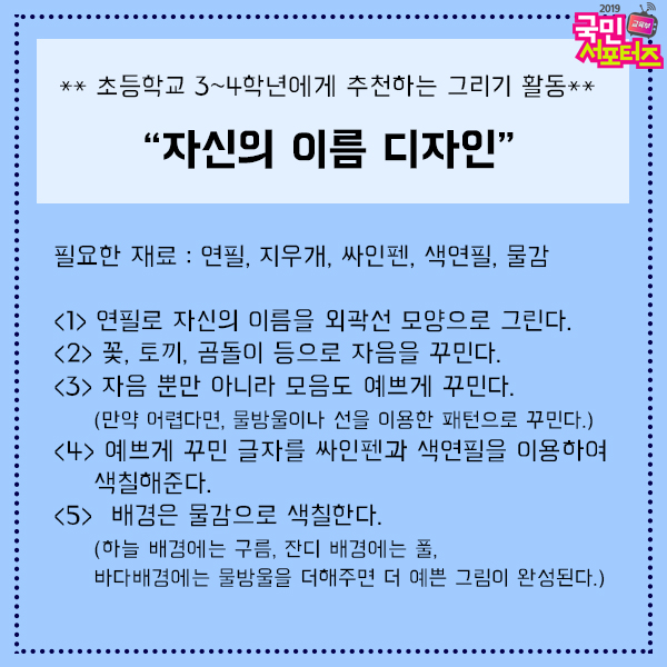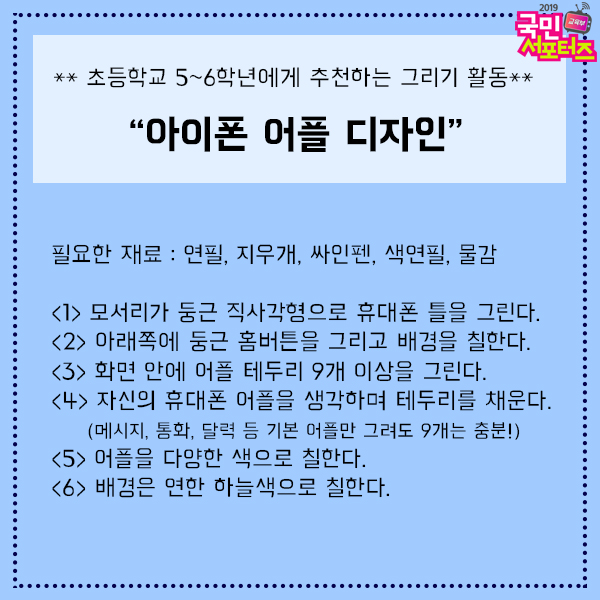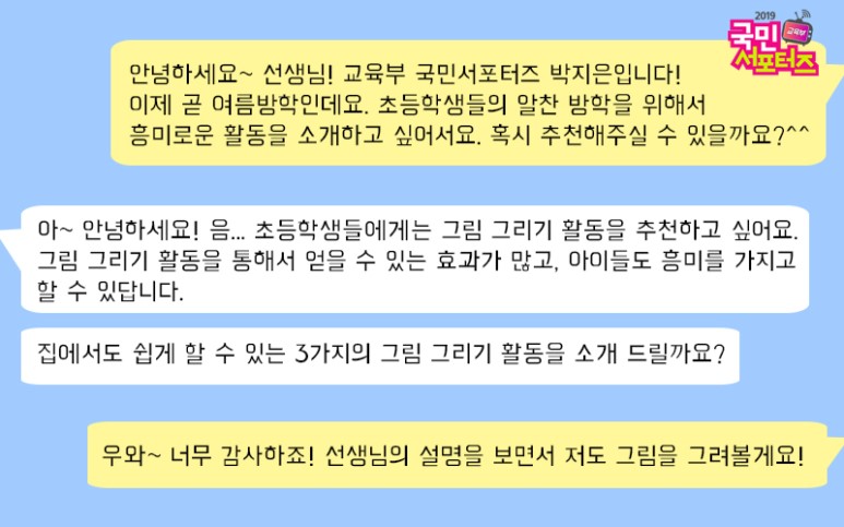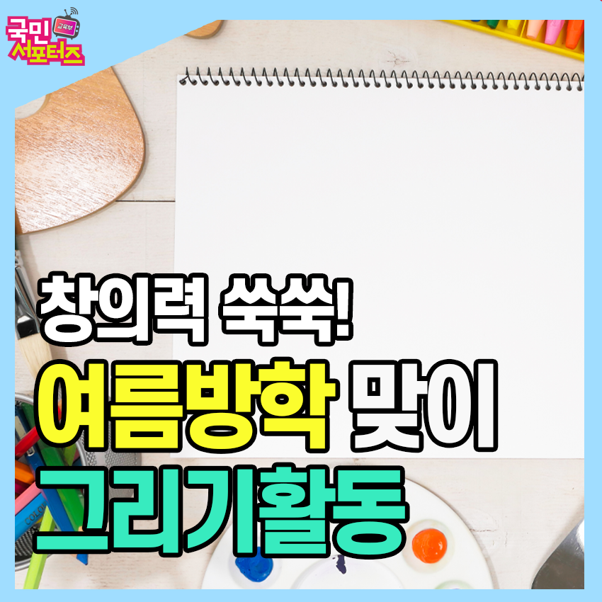 학교를 다니며 얻었던 스트레스를 날려버릴 수 있는 그림 그리기 활동! 이번 방학에는 그림 그리기를 통해서 여유와 취미를 찾고, 자신의 마음을 쉽게 표현할 수 있는 기회를 얻었으면 좋겠습니다. 대한민국의 멋진 미래가 될 초등학생들의 행복한 여름방학을 교육부 국민서포터즈가 응원합니다!