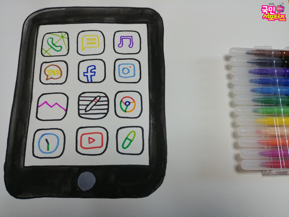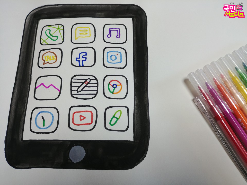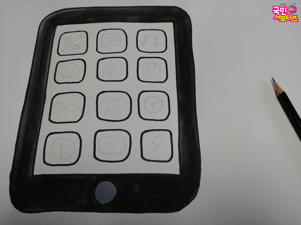 카메라와 갤러리, 인터넷과 시계, 각종 SNS 등을 그려보았어요.