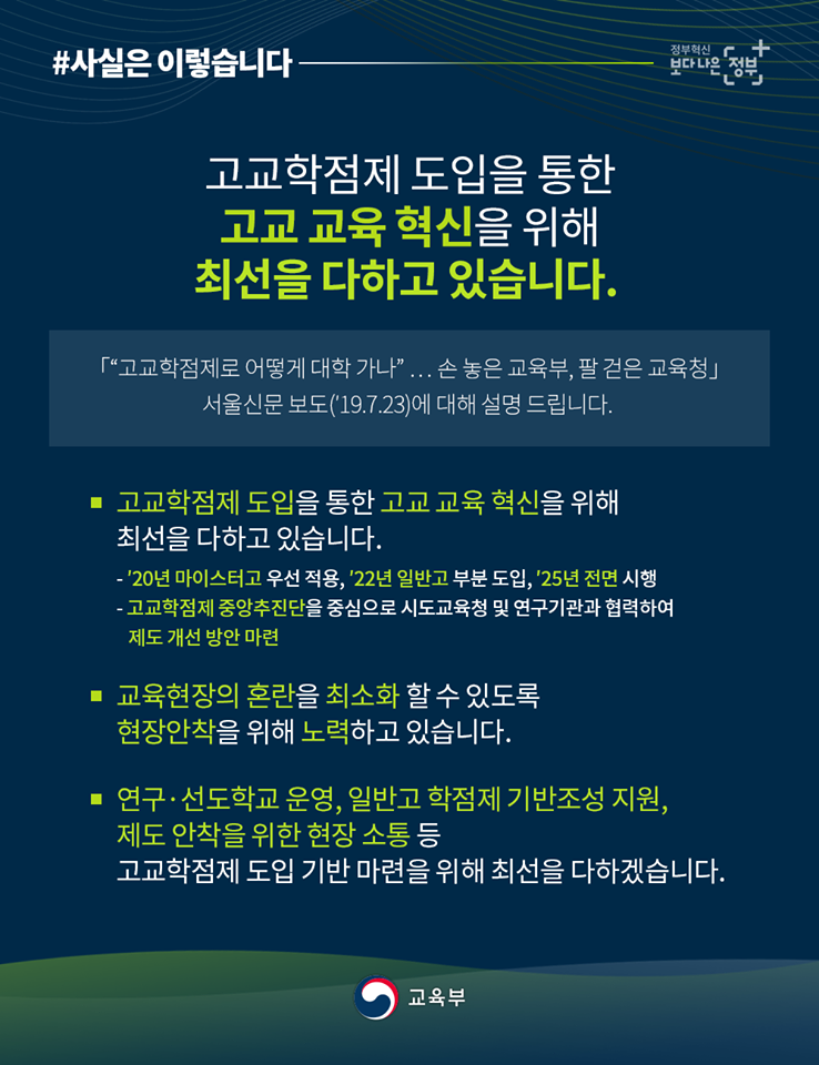 교육부는 고교학점제 도입을 통한 고교 교육 혁신을 위해 최선을 다하고 있습니다.