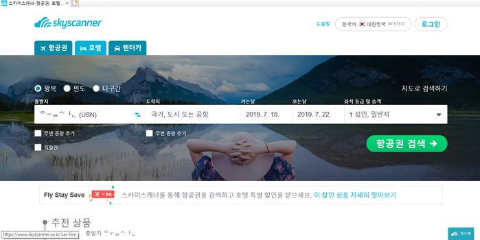 먼저, 최저가항공을 비교할 수 있는 사이트로 출발지와 도착지를 설정해 항공권 검색을 합니다.