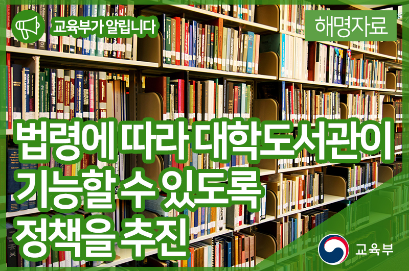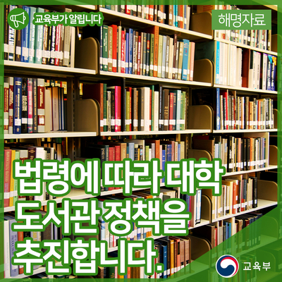 교육부는 법령에 따라 대학도서관이 대학 교육과 연구의 핵심기관으로 기능할 수 있도록 정책을 추진하고 있습니다.