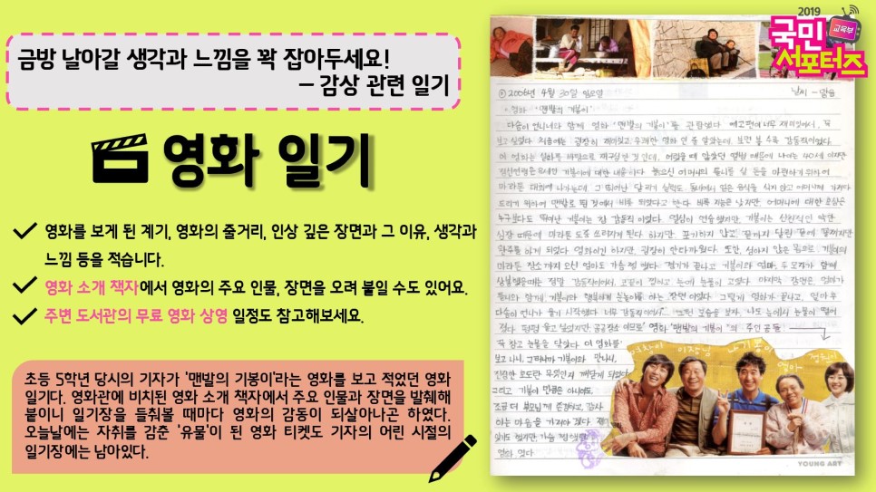 여름방학을 겨냥한 영화들이 속속 개봉하고 있는데요! 이러한 영화를 본 하루 일과도 단연 일기의 글감이 될 수 있습니다. 영화 일기의 큰 틀은 독서 일기와 같습니다. 저는 영화 일기를 적을 때면 영화 티켓을 함께 붙여놓기도 하였고, 영화관에 비치된 영화 소개 책자를 챙겨와 기억에 남는 인물과 장면의 사진을 오려 붙이기도 하였습니다. 지역 도서관에서도 정기적으로 흥미진진한 영화를 무료로 상영하니, 우리 동네의 도서관 누리집도 한 번 들러보세요.