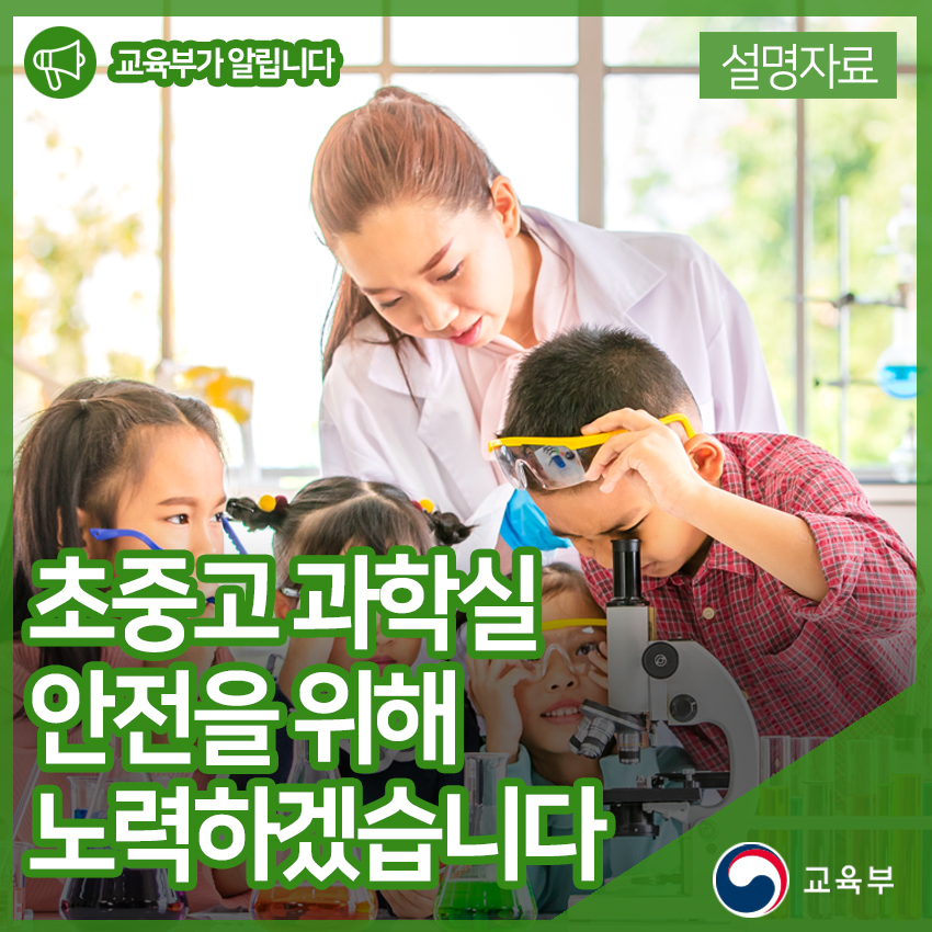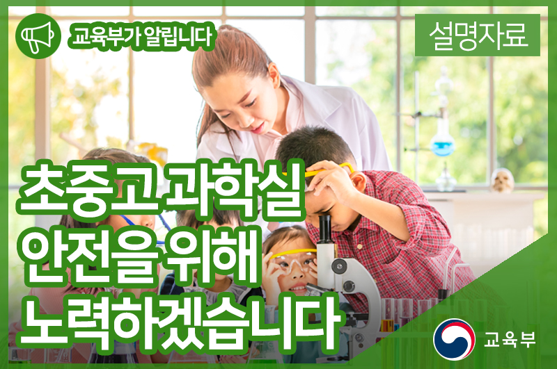 앞으로도 교육부는 시‧도교육청 및 유관부처와 협력하여 초․중․고 과학실의 안전한 환경 조성을 위해 지속적으로 노력하겠습니다.