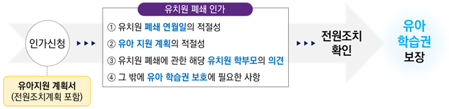 - 유치원이 유아 전원조치 계획 및 관련 서류를 갖춰 폐원을 신청하면, 교육감은 유아 학습권 등 공익적 판단에 따라 인가한다.