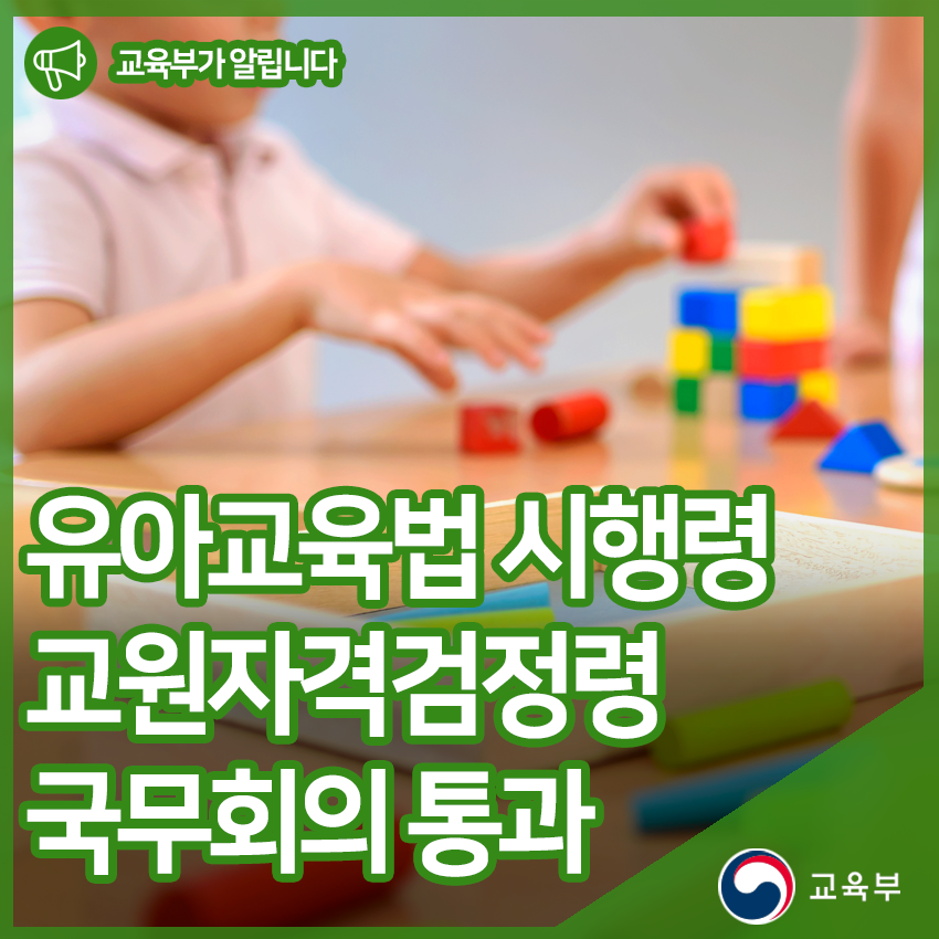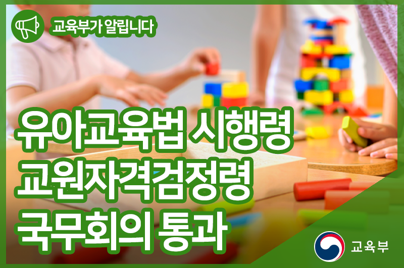 교육부(부총리 겸 교육부장관 유은혜)는 7월 30일(화) 국무회의에서 「유아교육법 시행령」 및 「교원자격검정령」을 심의・의결되었다고 밝혔다.