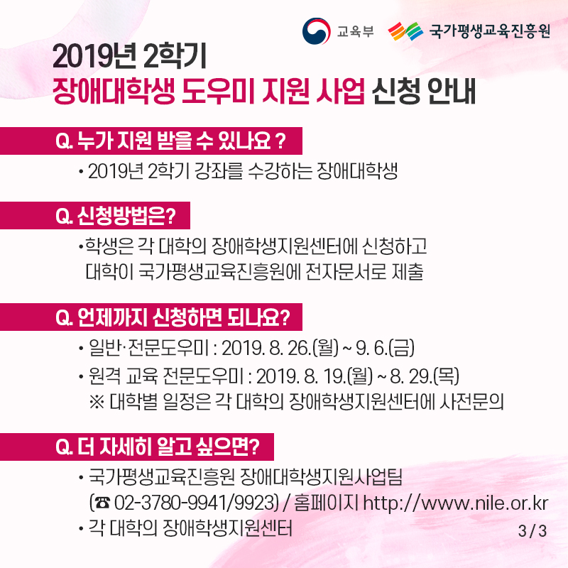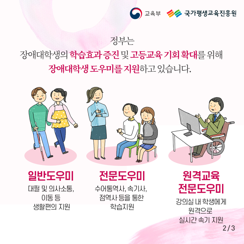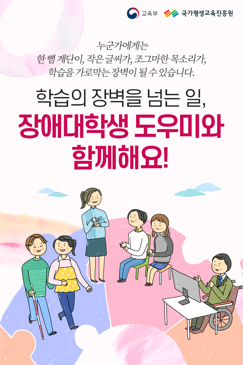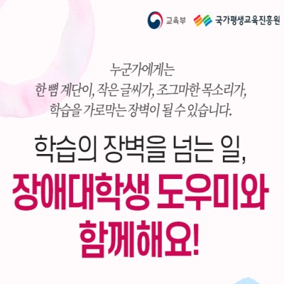 카드뉴스를 참고하셔서, 장애대학생 도우미 지원 사업에 대해 알아보세요~!