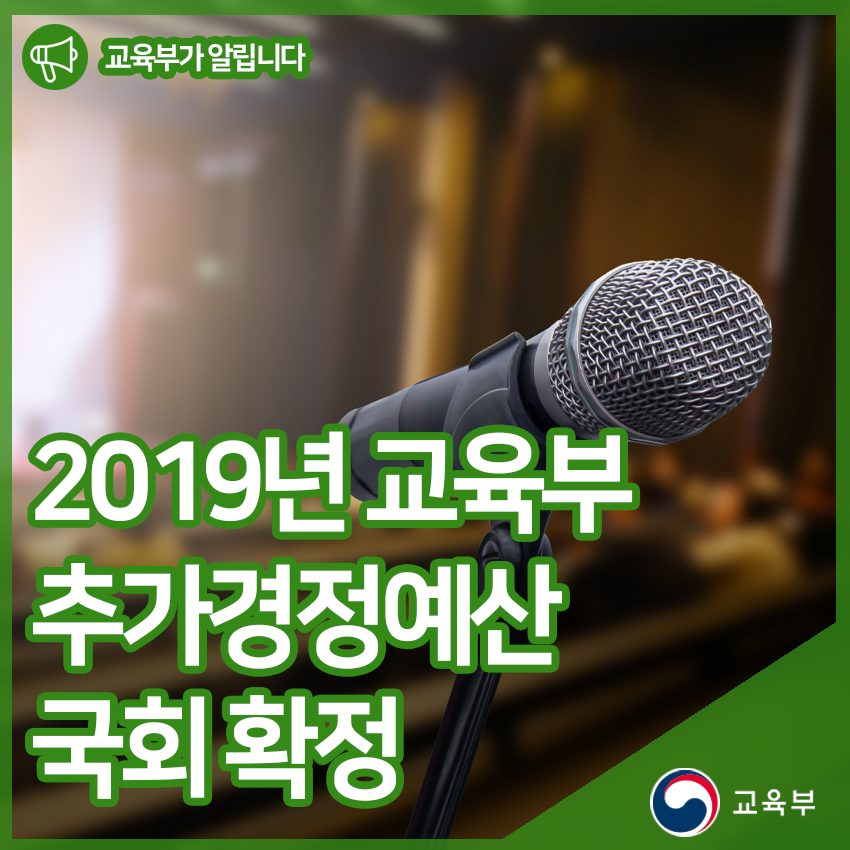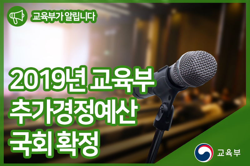 교육부(부총리 겸 교육부장관 유은혜)는 2019년도 제1회 추가경정예산을 ‘19년 본예산 74조 9,163억 원보다 887억 원 증액된 75조 50억 원으로 국회 심의․의결을 거쳐 확정했다고 발표하였다.