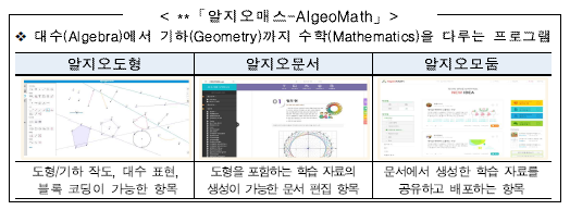 수학‧정보 교사가 함께하는 모둠활동에서 융합교육 가능성과 방법을 논의하고, 다양한 소프트웨어와 교구, 놀이 등을 활용한 쉽고 재미있는 교육 방법을 모색한다. 학생 정의적 특성에 맞춘 학습 개선 프로그램인 수학클리닉*, 블록코딩을 활용하여 쉽고 재미있게 도형을 작도할 수 있는 공학 도구인 알지오매스**를 체험한다.