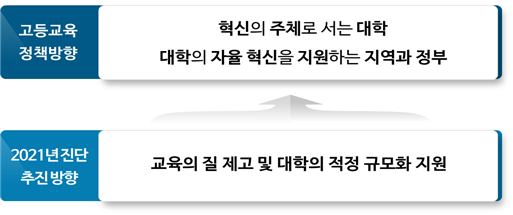교육부는 지난 8월 6일(화)에 발표한 ‘인구구조 변화 및 4차 산업혁명 대응을 위한 「대학혁신 지원 방안」’에서 “혁신의 주체로 서는 대학, 대학의 자율혁신을 지원하는 지역과 정부”를 고등교육 정책방향으로 설정하였다. 이러한 정책방향 하에서 ‘2021년 대학 기본역량 진단(이하 ’2021년 진단)’은 대학의 적정 규모화와 교육의 질 제고 지원이라는 진단의 목적과 기능을 보다 명확하게 정립하여 추진한다.