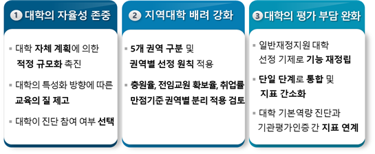 2021년 진단을 통해 적정 규모의 자율 혁신 역량을 갖춘 지역대학을 육성・지원할 수 있도록 지역대학에 대한 배려를 강화하여, 5대 권역을 구분하고 권역별 선정 원칙을 적용한다. 지난 2018년 진단에서 수도권과 지방의 교육여건 격차를 고려하여 5개 권역*으로 구분하고, 일반재정지원 대상 대학 선정 시 권역을 우선 선정하는 방식을 새롭게 도입하였다. 2021년 진단에서는 국가 균형 발전을 위해 2018년 진단보다 권역 비율을 확대*하여, 권역에서 90%를 우선 선정하고, 전국 단위로 절대점수가 높은 순서대로 10%를 선정한다.
