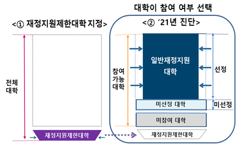 특수목적 재정지원사업과 관련하여 진단에 참여한 대학은 신청・지원 가능하고, 대학의 선택으로 진단에 참여하지 않은 대학에 대해서는 신청・지원을 일부 제한*한다.